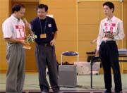トーナメントは、基本的にやはり予選タイムの良いマイコンカーが勝利するが、番狂わせもある。一番大きかったのが、昨年のロボフェスタ神奈川2001で優勝したテクノチップス(株)竹村不二夫さん「ミニマッハGO」だろう。前日、ロボット展示ということでデモ走行をし、調整は万全かと思われたがなんとトーナメント2回戦でまさかの脱輪。そして会場からどよめきが。今年の1月に行われた2002年全国大会でも同様にトーナメント途中で脱輪してしまった竹村さん。悪夢を見ているかの様だった・・・