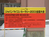 | 2003年1月12日午前9時、まちに待った開会式。明け方から降り続いていた雪がうそのようにやんだ。まるで会場内の熱気がそうさせたように...。今年も昨年を越える参加総数2023台のうち、精鋭218台が今日の全国大会への切符を手にしていた。「ものづくりを通して人をつくろう。この大会を経て世の中に出、立派に活躍している先輩たちがいる。皆さんもこの大会を通じて得たものづくりの経験を活かしてもらいたい。」主催者である全国工業高等学校長協会・原田理事長からの力強い呼びかけは、選手たちを一層勇気づけたようだ。そして前回、高校生の部団体優勝の四国地区を代表して香川県立三豊工業高校の石川真人選手による優勝旗返還、続いて同じく香川県立三豊工業高校の石川信吾選手による選手宣誓。やがて高らかな選手宣誓に送り出されるように、選手たちは自分自身と各地区代表のプライドをかけて、開会式会場を後にしていった。今まさに壮絶なバトルの幕は開いた。 |