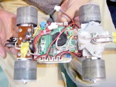 防衛大学校 宮川さん。SSM方式、前輪駆動、左右独立モータ。モータは逆回転をかけて急ブレーキをかけている。車体のバランスに気を遣ったそうだ。 |