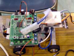 | テクノチップス(株) 竹村さん。遊星ギヤーボックスと指定モータを1輪1組使用。スポンジタイヤに薄い透明のシリコンシートを貼っている。ロータリーエンコーダを使用してスピード制御を行っている。試走時は、デバッグにブザーを使っていた。 |