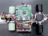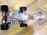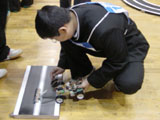 | 高校生の部で優勝した宇都宮工業高校 園部さん「UK−SNB3」。前輪部に重りを付け安定させている。アナログセンサ、エンコーダ搭載。クランクを抜けるパターンなど、プログラムを試行錯誤したとの事。 |