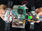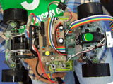 水野さん「韋駄天磯工」。マクソンギヤによるステアリングは21:1。駆動部は11:1のギヤ比。基板を工夫したとのこと。 |