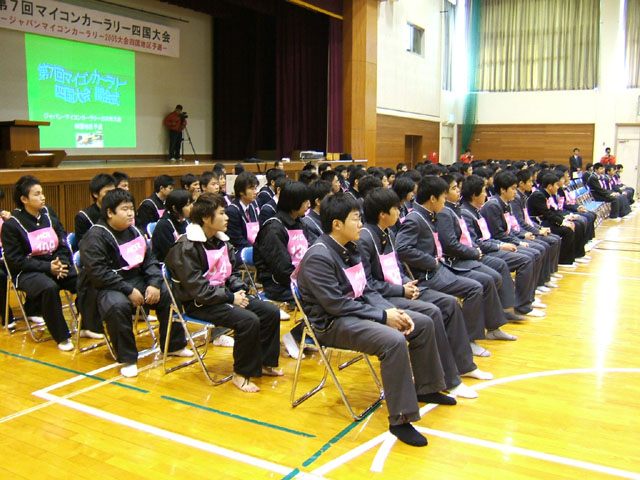 2004年11月23日(祝)、今年も香川県立志度高等学校でジャパンマイコンカーラリー2005四国地区大会が開催された。当日は雲ひとつない快晴で、11月も終わりに近づいたというのにポカポカ陽気の1日であった。今回の参加台数は、高校生の部126台、一般の部15台と昨年なみ。競技は高校生の部、一般の部とも、2台併走のタイムレースを2回行い、タイムの良い方を記録として順位を競う。
