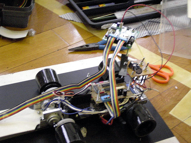 佐織工業高校 竹原君「佐織1号」。CPUボードが縦置きなのが特徴的。CPUを縦置きにしたのは車体を小さくしたかったためとのこと。ホーイルはアルミの削り出しで、電源は電池を8本直列に接続。 |