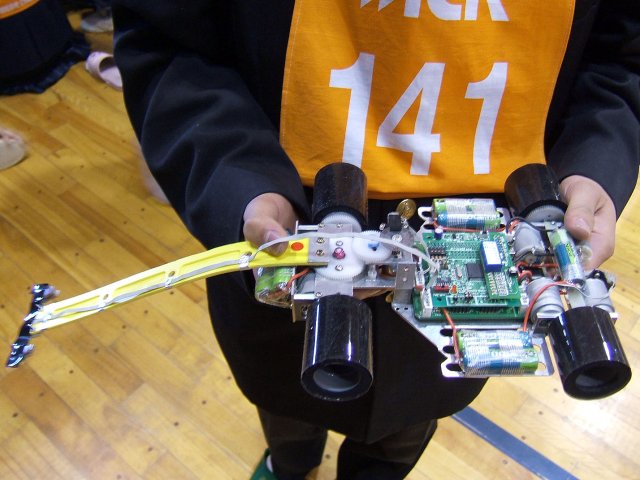 つくばろぼっとサークル 品田さん「Sentinel」。駆動モータはエリートというモータで4WD。ギヤ比6:1。ステアリングモータも同じモータでギヤ比55:1。アナログセンサ4個。塔の様に立っているのは、センサの前を見るためのセンサでカーブ直前でブレーキをかけている。アッカーマンリンク機構でこの部分の製作が苦労したとのこと。 |