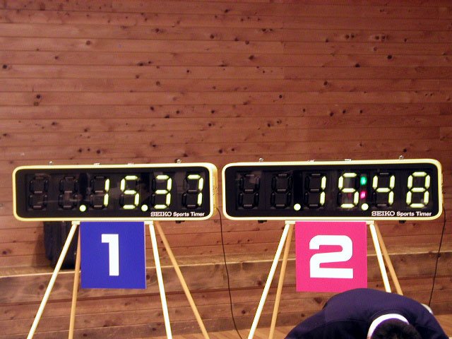 TEAM UNPONTAN 吉川さん「やったるデー」。モータは指定モータで後輪駆動、1輪2モータ。貫通シャフトを使用して軸は回さず、ホイール部分を回している。ステアリングは通常モータをマイコンで制御している。センサはアナログ2個、デジタル4個。電池は8本をモータに加えている。風車は、娘さんの物で飾り。次回は、回転部分にエンコーダを付けてスピード検出をしたいとのこと。 |
