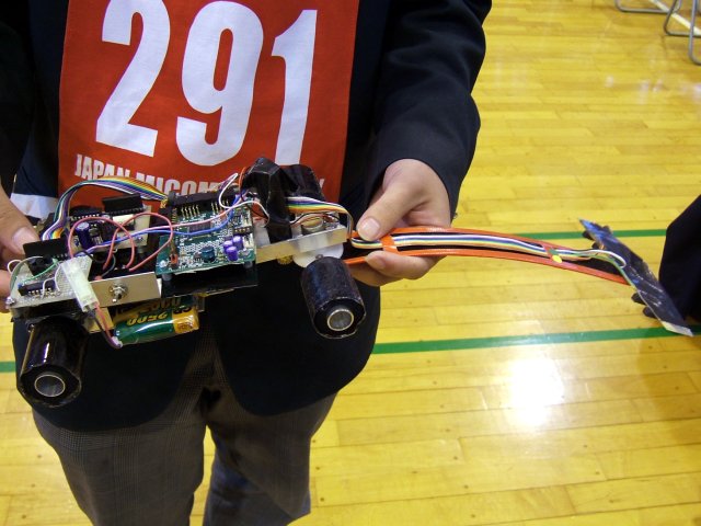 一般の部 優勝 九州産業大学付属九州産業高等学校OB 貞方さん「asout」。後輪駆動でマクソン製のREmaxを使用。ステアリング制御も通常のモータで行っている。アナログセンサ2個、デジタルセンサ4個でコーストレース。ホイールはアルミを旋盤で削りだし作成。デバッグは24C256というEEP-ROMに走行データを記録させエクセルで解析、プログラムの調整に役立てたとのこと。論理的な解析が優勝の秘訣かもしれない。 |