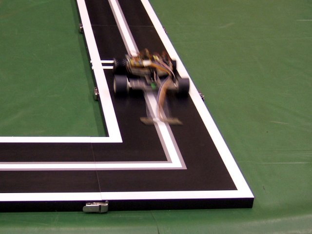 | 神奈川県立藤沢工科高等学校 豊田君「黒い閃光」。後輪は1輪2モータ、前輪は1輪1モータの4WD。ギヤ比は60:8。普通のモータでステアリング制御。センサはアナログ4個、デジタル4個。カーボンシャーシに穴を開けて軽量化している。先読みセンサで、ラインセンサの前を見てカーブ、上りでブレーキをかけている。 |