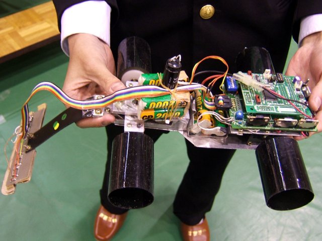 山梨県立韮崎工業高等学校 篠原君「クライス・E」。サーボの回転位置を、前輪の軸と軸の間より内側にしている。それによりカーブでスムーズに曲がれるようになったとのこと。ホイールは、アルミ製のシャフト受けを旋盤で、ホイール自体はフィルムケースを使用している。プログラムは、サーボの位置を変えた事による変更に苦労したとのこと。 |