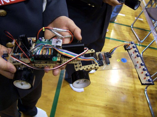 愛媛県立今治工業高等学校 教諭 橋本さん「鯨3号」。後輪駆動でハイスピードギヤボックスを使用。学生モータを使用。センサはデジタル7個。リセット対策に苦労したとのこと。 |