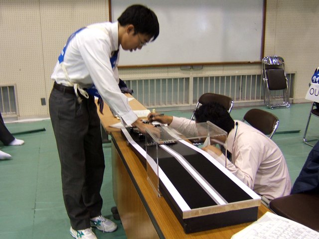 岐阜県立岐阜工業高等学校 田中君「Insert」。4WDで駆動ギヤ比8:54。ニッカド電池8本使用。ステアリング部に上り検出センサとしてキットのセンサを上手く利用。アナログセンサでスムーズなトレース。ブレーキをかけすぎると跳ねてしまったのでブレーキを少なくしたとのこと。 |