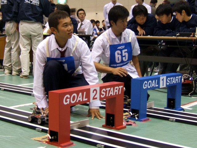 | 静岡県立浜松城北工業高等学校 伊奈君「鴉」。上にある2つの素子はモーションセンサ。通常のセンサより先のコース状態を検出し、カーブやクランクを見ているのが特徴。電池7本、駆動は後輪駆動で遊星ギヤ5:1を使用。 |