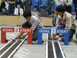 結果は、東京都立小金井工業高等学校 雨谷君が19.25秒で2位との差を4秒以上もひろげ優勝した。決勝トーナメントでは、予選1位の雨谷君が決勝戦でまさかの脱輪、予選2位の遠藤君が決勝トーナメントを制した。アトラクションの部は、小金井工業高等学校の斎藤君(右下写真)が、予想タイムと走行タイムの差わずか0.04秒で優勝した。