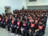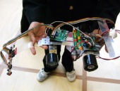 北海道滝川工業高等学校 松尾 弘樹君「Destiny」。自作ギヤボックスで、1輪2モータの後輪駆動。後輪が大きいのが特徴。アルミ製のシャーシを上下2段にして、剛性を高めている。プログラムは、コーナーがスムーズに走るよう何度もハンドル切れ角を微調整したとのこと。 |