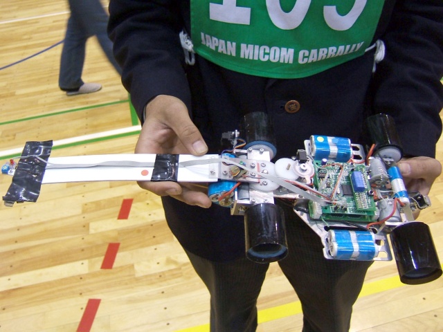 群馬県立渋川工業高等学校 松井 和也君「野人我Z−Jr」。前輪1輪1個、後輪1輪2個の4WD。ステアリングはmaxonのRE21モータを寝かせて使用。軸間調整に苦労しているとのこと。プログラムはカーブでは外輪を計算値より多く回している。クランクは内輪を逆転させ脱輪しないようにしている。 |