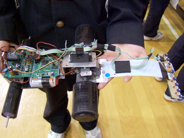 | 高橋 久志さん「野人我Z−貴族」。指定モータで後輪1輪2個、前輪1輪1個の4WD。ギヤ比は60:8。ステアリングはmaxonモータを横にしてベベルギヤで90度曲げている。ダンパーとスタビライザーでシャーシのロールを制御している。ステアリングの曲げ角を検出するボリュームにノイズが乗り苦労したとのこと。 |