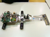 鈴木 友和さん「GRV Ver1.0」。シャーシに中空ポリカーボネートを使用。加工がし易い。後輪駆動で指定モータ1輪2モータ。サーボはKOプロポのPDS-2413ICS。ホイールはフィルムケースを使用している。エンコーダで全てのスピード制御をしており、加速と減速のバランス調整に苦労したとのこと。 |