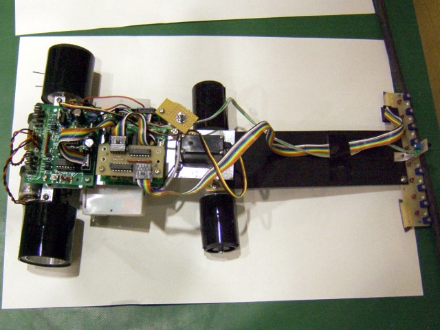 6Vを1個使用。ボールデフによる後輪駆動。4WSで前後にステアリング用のモータがあり、斜めに平行移動出来る。レーンチェンジでその効力を発揮している。後ろのステアリングはmaxonのREモータ、前はREmax17の12Vを使用。ポリカーボネート材でサス機構を搭載している。 |