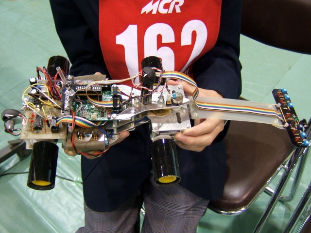 愛知県立豊田工業高等学校 高木 裕之君「ジジジジ α」。後輪1輪2モータ、前輪1輪1モータの4WD。KOプロポのサーボでステアリング制御。センサはデジタル8個。シャープGP2D12を使用してスタートバーの開閉を判断している。シャーシは比較的柔らかい材質を使ってサスペンションのような働きにしているとのこと。 |