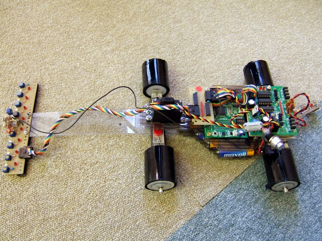 東北工業大学 電脳からくり同好会 佐藤 太一さん「提灯鮟鱇」。サーボは通常のモータを使って制御している。センサとハンドルの切れ角度はセンサ2に対してハンドルは1にしている(SSM機構)。シリコンにてタイヤを成型して製作。 |