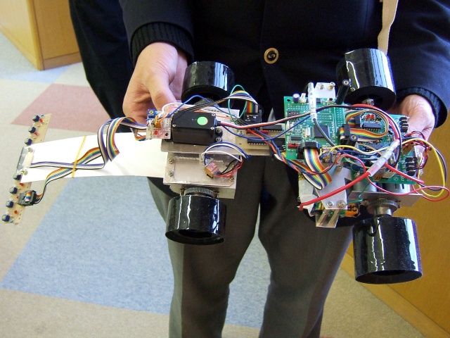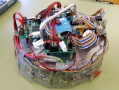 | S.N.C.T. 野田 道広さん「未確認走行物体」。球体移動で、本体の向きを変えずに走行する。16個のセンサを本体の回りに配置してコースを呼んでいる。2個のボールをそれぞれ2個のモータで自在に回転させ進む方向と本体の向きを制御している。2個のボールの回転方向を決めるのに苦労したとのこと。 |
