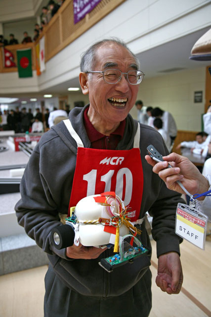 午前9時40分、いよいよ待ちに待った競技の開始である。一般の部の予選は、午前11時10分にスタート。高校生の部で教え子たちが健闘する中、コースに姿を現した熊本県立球磨工業高等学校教諭の石井勝選手が、Aグループ1組目で18.77秒といきなりの好タイムを記録。「さすがに、一般の部は安定している」と観客を唸らせた。ところが、その後レース展開は波乱に満ちた様相を展開する。Bグループ2組目で、ともに地区予選を1位で通過して今大会に臨んだ、北東北地区の今井豊選手と、山形地区の大坂友人選手が対戦。しかし、両者ともコース序盤でレーンをはずれ、あえなくリタイヤとなった。また、2005年大会の優勝者・四国地区代表の中尾伊知郎選手もゴールできずに姿を消す。さらに、2006年大会で最速タイムを打ち出した九州地区の綿貫祐介選手も、中盤まではさすがのパフォーマンスを展開するも、何でもないはずのカーブで突然の脱輪。レース後、綿貫選手は「バグとしか考えられない」と唇をかみ締めていた。予選前半のトップの座についたのは、北信越地区大会を制した藤井愛香選手。高校生の部を席巻した富山県立大沢野工業高等学校の職員をされているそうで、観客から「大沢野恐るべし」の声も上がっていた。続く予選後半も、波乱含みの展開となってしまった。2006年大会の準優勝者で、今大会の地区予選も堂々のトップで通過し、まずは難なく初戦を飾ると見られていた、防衛大学校情報工学科の榮井弓子選手が、まさかのコースアウト。「控え室の試走コースの走行から、車体の形状がコースに合っていないように感じていたのですが、その不安が的中してしまいました」と肩を落としていた。Dグループ12組目には、強豪揃いの四国地区大会を制した福永信雄選手が登場。マシンが見せたブレの少ない挙動に、予選トップ通過を予感させた。ところが、17.89秒のタイムを計測するも、車体はゴールを通過したあたりで仰向けになって転倒。急遽審判団が集まり、協議が始まった。数分間におよぶ中断の後、審判団が下した結果は、なんとコースアウトによる失格。衝突に備えてゴールゲート手前に設置してあったスポンジに、コースをはずれた車体がヒットしていたのである。福永選手はこの判定に、ただ天を仰ぐしかなかった。観客を沸かせたのは、Cグループ4組目にスタートしたチームMTYの勘原利幸選手。迫力いっぱいの走りで、まさにあっと言う間にゴールを駆け抜け、電光掲示板に映し出されたタイムは、驚愕の17.55秒。全体を通しても、今大会の最速タイムをたたき出した。また、Dグループ7組目の杉谷光太郎選手は、18.12秒で予選2位に食い込む。杉谷選手も、富山県立大沢野工業高等学校教諭とあって、ここでも大沢野工業高等学校が周囲を驚かせた。さて、勝敗とはまた違った部分で楽しませてくれるのが、一般の部の魅力である。今回も、主にアジア諸国から日本に派遣されている技術者の皆さんが、チームJICAとして参加。どのマシンもゆっくりのんびりの走りが信条とは言え、その完走率は高い水準を示してくれた。また、大人だけでなく小・中学生の参加が認められているのも、会場を沸かせる一因となっている。今回は、中学生の中岡郁晴君が18.27秒の素晴らしいタイムで、予選を6位で通過。小学生の佐藤駿光君も28位で見事に予選を通過し、並み居る猛者たちと立派に渡り合えることを証明した。