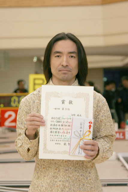 一般の部のベスト8は、第1レースに今大会屈指の好カードが組まれた。方や、この日最速タイムを出したチームMTY・勘原利幸選手。方や、九州大会の覇者で、初の全国制覇に挑む、熊本県立球磨工業高等学校教諭の中村彰男選手である。注目のスタートの後、コースの特性を完全に把握した中村選手のマシンは、さっそうとゴール。タイムは18.03秒だった。勘原選手は、決勝トーナメント1回戦での連続コースアウトからマシンを立て直せないままでレースを迎えてしまい、結局ゴールできずに今大会を終えた。続く第2レースは、人格者としてマイコンカー愛好家たちに広く知られている河野純也選手と、北関東地区大会のチャンピオン・阿佐美斉選手という、実力者同士の対戦だ。2台のマシンは中盤までほとんど差もなく走ったが、後半になると河野選手のマシンが徐々にリード。最後は、18.02秒でゴールし、18.90秒だった阿佐美選手を退けた。第3レースは、予選2位通過の富山県立大沢野工業高等学校教諭の杉谷光太郎選手と、熊本県立球磨工業高等学校教諭の石井勝選手の対戦。ともに、高校生の部で活躍したチームの指導者でもある。レースは、今大会でも稀に見る僅差の戦いだった。最終的には、18.34秒でゴールした杉野選手が、18.46秒の石井選手を辛くも上回った。続く第4レースは、中学生ながらここまで見事なパフォーマンスで勝ち上がってきた中岡郁晴選手が、(株)三洋メディコムソフトウェアの藤坂浩史選手と対戦。持ちタイムは1秒以上の差で中岡選手が勝っていたものの、そのスピードをマシンが制御しきれなかったのか、序盤でコースアウトしてしまった。藤坂選手は、準決勝でも優勝候補のひとり杉谷選手のコースアウトという幸運に恵まれ、決勝の舞台へと昇りつめた。その対戦相手は、強豪同士の争いに勝利した中村選手となった。3位決定戦は、どちらが勝ってもおかしくない好カード。しかし、杉谷選手のマシンがまたしてもコースから飛び出してしまい、河野選手が18.06秒のタイムで勝者となった。かくして、『ジャパンマイコンカーラリー2007全国大会』の大トリを飾るファイナルレースのステージには、中村選手と藤坂選手の両名が立った。緊張のスタートを前に、静寂につつまれる会場。2台のマシンが放つ小さな電子音が、心なしかいつもより大きく聞こえてくる。ゲートが開いた瞬間、すでに勢いで中村選手のマシンが勝っている。そのまま差を広げ、18.11秒のタイムで優勝。本人曰く「夢にまで見た全国優勝」の瞬間を迎え、感動を隠し切れない面持ちであった。 |