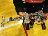 11月11日は開会式に続き「高校生の部」が開催。まず今年から新設された「Basic Class」のレースが行われた。1回目の今年は、32校92台が参加。ほとんどがマイコンカー初心者であるわけだが1回の走行タイムで順位が決まってしまうという、レースとしては高校生の部と変わらず厳しいものだった。そんな中33台が完走し、優勝は24.48秒というこのクラスにしては見事なタイムで、熊本県立球磨工業高等学校の小田君が獲得。準優勝には熊本県立御船高等学校の増本君が、25.65秒というこれまたすばらしいタイムで入り、この2名が全国大会出場を手にした。