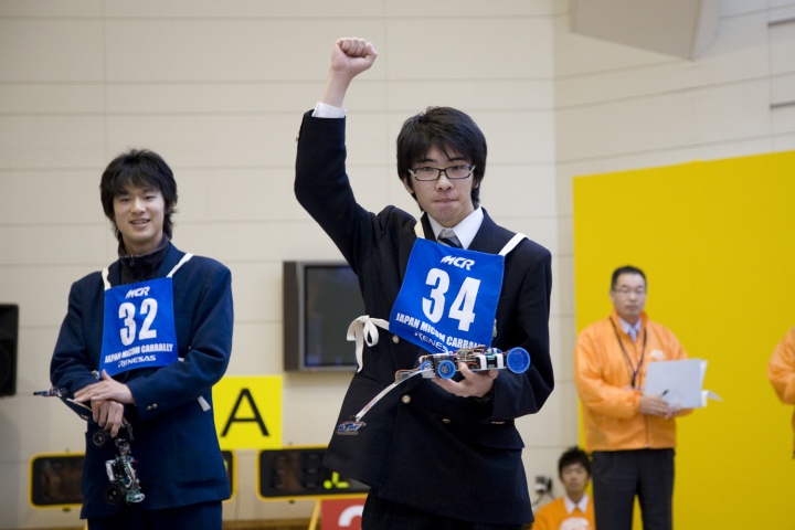 午後2時10分。Basic Classの部の決勝トーナメントに進出した16台が、コース前に集合した。ここからは、より速くゴールゲートを駆け抜けた方が勝ち上がる。例年通り、対戦相手との駆け引きが重要な要素となってくる。早速、Aコース1組目に予選トップの岡山県立玉野光南高等学校・松浪潤一君が、Bコース1組目に同2位の福井工業大学付属福井高等学校・渡邊幸之介君が登場。松浪君が29.30秒で走り切り、一方の渡邊君は29.42秒を出して肉薄した。上位組が順当に勝ち進む中、予選5位の兵庫県立小野工業高等学校・村上大河君がコースアウト。対戦相手もコースアウトしたため、辛くも予選タイムの差で勝ち上がるも、その後のレースに不安を残した。唯一の下剋上は、Aコース2組で予選9位の香川県立高松工芸高等学校・八木貴之君が、予選8位の福岡県立小倉工業高等学校・岡雅人君を退けたレース。その他の対戦はいずれも、予選上位組が順当に勝ち残り名実とも実力者同士の戦いとなっていく。まずは、ここまでトップタイムを誰にも譲り渡していない岡山県立玉野光南高等学校・松浪潤一君がベスト8初戦に挑み、Basic Classの部ではこの日初の28秒台となった28.97秒を打ち出した。松浪君のマシンは、いよいよ本気モードに突入してきた様子である。その他は、すべて持ちタイム上位者が勝ち残り、予選1位から4位までによる準決勝へと舞台が移っていく。絶好調の松浪君と、愛媛県立松山工業高等学校・柳田亮君の対戦は、松浪君が28.93秒とさらにタイムを縮めたのに対し、前走をコースアウト(対戦相手のコースアウトによりタイム差で勝ち残り)した柳田君のマシンが大きく後れを取り、ここで力尽きた。福井工業大学付属福井高等学校・渡邊幸之介君と兵庫県立姫路工業高等学校・藤原洸太君の対戦は、藤原君のマシンが無念のコースアウト。かくして、決勝戦は予選成績通りの対戦となった。先に行われた3位決定戦は、準決勝とは見違える走りを披露した柳田君が30.58秒で勝利。力強いガッツポーズも飛び出し「初めての全国大会で良い成績が残せて満足です」と笑顔で語っていた。その余韻が冷めぬまま、Basic Classの部のナンバー1を決する舞台が整った。「ここまで来たら優勝したいです」と力を込める松浪君に対し、「思い切り走ります」と静かに語る渡邊君。スタートバーが開くや、マイコンカーの行く先を点検するように指さし確認する松浪君。一方の渡邊君は、自分のマシンの走りに集中している。そして、いち速くゴールしたのはやはり、松浪君のマシンだった。計測されたタイムは28.94秒。「1年間の努力が報われて、とてもうれしいです」と笑顔が弾けた。渡邊君も29.29秒と自己ベストを更新する大健闘。「優勝できなかったのは残念ですが、ここまで来れて本当によかったと思います」と、微笑んでいた。