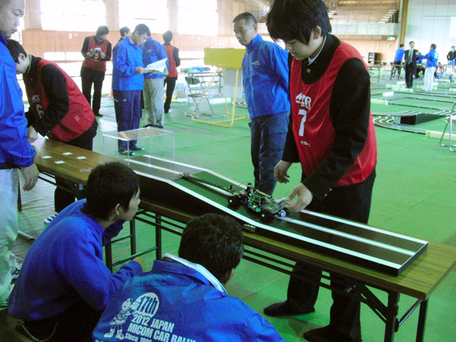 「ジャパンマイコンカーラリー2012中国地区大会」が2011年12月04日(日)、宇部市武道館にて開催された。参加は、岡山県、山口県、広島県、島根県、鳥取県の5県からAdvanced Class 89台、Basic Class 132台、合計221台33校の参加となった。競技は、Advanced Class、Basic ClassともにIN側、OUT側から各1回ずつ走行しベストタイムを記録とする。Advanced Classは上位30台がもう一度走行し、3回走行のベストタイムを記録とする。