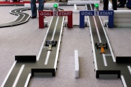 1走目で見事ゴール−香川県立高松工芸高校・太田 陸君(左)と岐阜県立可児工業高校・板津 慶和君(右)のマイコンカー