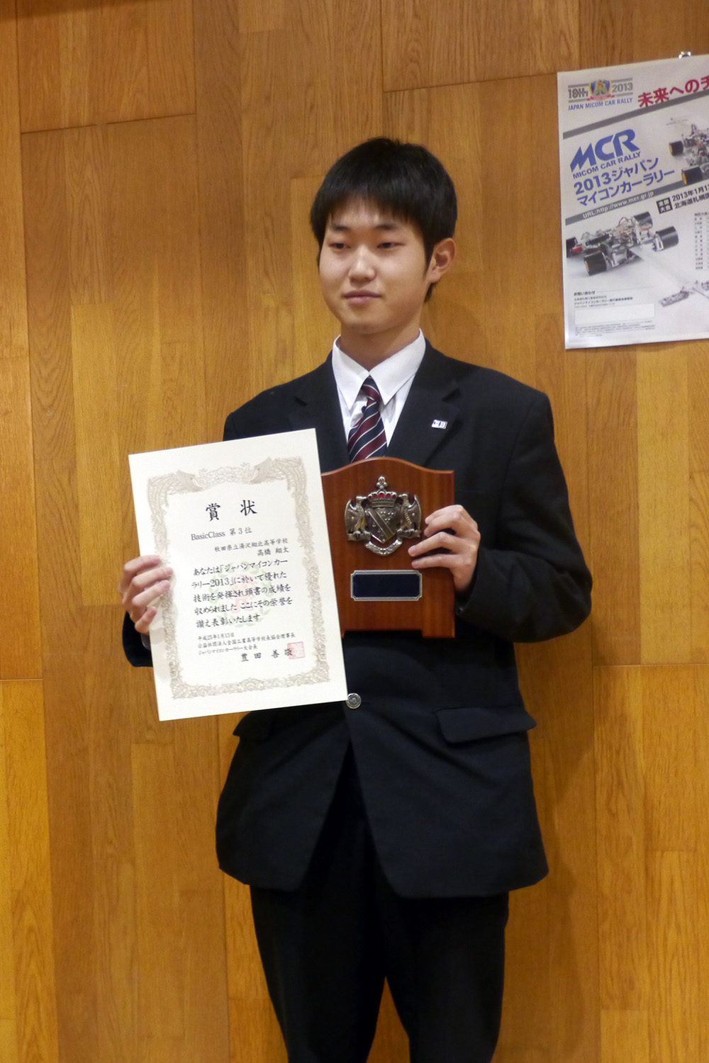 決勝前に行われた3位決定戦は奇しくも予選同タイム・同順位での決勝トーナメント進出の2台が対戦することになった。注目された競技開始、ホイッスルが鳴り、スタートバーが開くと同時に観客席から嘆息が・・・。高橋君の「あくび」が発進しなかったのである。大藤君の「M3A03」は順当に周回し、審判の指示でピックアップされた「あくび」のスタート位置を過ぎたところで、今度は「M3A03」がコースアウトするという驚きの展開。大会規定で準決勝のタイムにより秋田県立湯沢翔北高等学校の高橋 翔太君が第3位に輝いた。