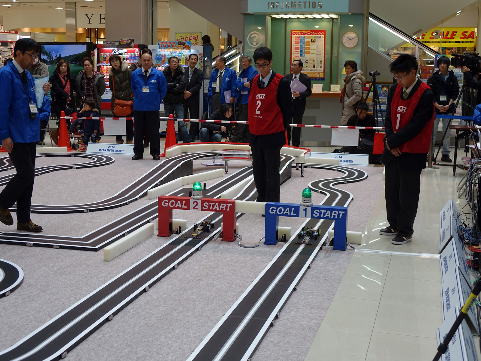 午前10時10分、ついに競技がスタート。タイムトライアル方式による予選は、2台同時にスタート、インスタートとアウトスタートを入れ替えてそれぞれ走行し、そのベストタイムで順位を競い合う。JMCRの競技はAdvanced ClassとBasic Classに分けられる。Basic Classは、初めてマイコンカーラリーに取り組む生徒を対象としたもので、全国大会に出場できるのは34台、予選上位タイムの4名が決勝トーナメントに進出、というとても狭き門であるが、年々地区大会のBasic Class人口は増加している。