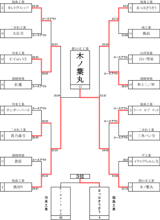 Basic Classの予選は、福島県立福島工業高等学校・宮島 幸大君が22.17秒を記録し2位と1秒以上の差をつけ、堂々の1位。福島県立郡山北工業高等学校・楠 健吾君が23.73秒を記録し、2位。福島工業・目黒 将暉君が24.23秒を記録し、3位となった。トーナメントの結果は、予選2位の郡山北工業・楠 健吾君が23秒台の安定した走りを見せ、優勝。予選1位の福島工業・宮島 幸大君がスピードを上げたためか2回戦でコースアウト。予選4位の福島工業・大泉 克哉君が決勝戦で25.04秒を記録し、準優勝。予選3位の福島工業・目黒 将暉君が3位となり、番狂わせとなった。
