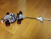 職場に用意されている簡易コースと実際のコースではグリップの差があり、本番コースでは相当速度が上げられる為、試走で最適値に調整しなおすのが大変です。また職場コースが狭いため、マシンクラッシュが頻発し、すぐにステアリン グ機構や駆動部分にガタが出てしまい何度も部品を作り直しています。