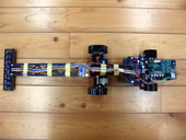 前輪駆動で、カーブやクランクを速く走行できるようにしました。ボディにはカーボンを使用し軽量化しましたが、四国大会後にサーボ周りの変更とモータ側の電池にアルカリを使用したことによってかなり重くなってしまいました。カーブでのサーボの曲げ角をなるべく少なくできるように、センサーバーを長めに設計しました。