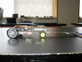 加速が安定するように、駆動側のホイールを以前のマシンよりも大きく作りました。大会前日の試走などで、素早く調整できるように液晶を使って数値の変更ができるようにしています。整備や修理が簡単にできるように、できるだけシンプルな構造にするように、マシンの設計をしました。 |