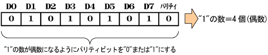 データ8ビット分+パリティビットの各ビットの"1"の数が偶数になるようにパリティビットを設定して、送信します。受信側にも、"1"の数が偶数と設定しておけば、偶数ならエラー無し、奇数ならエラーと判断できます。エラーなら、パリティエラーとなります(下図)。
